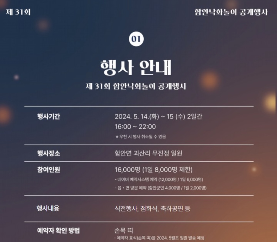 함안낙화놀이는 함안 무진정 일대에서 열리는 축제로 낙화놀이를 보러 가게 된다면 아주 많은 사람들이 방문하기에 예약자 유의사항을 읽어보고 가면 축제를 더욱 잘 즐길 수 있을 것 같다.